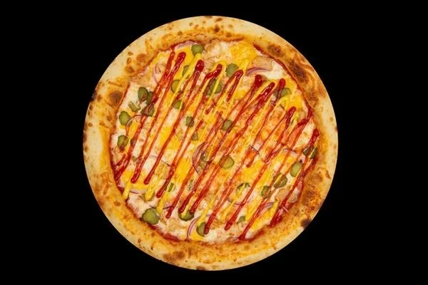 Тесто бруклинское, томатный соус, моцарелла, чеддер, курица су-вид, огурец маринованный, лук красный, горчичный соус, кетчуп. (30см.)