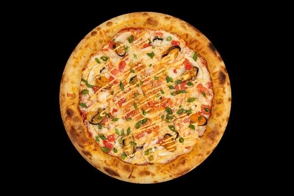 Тесто бруклинское, томатный соус, моцарелла, шампиньоны, мидии, креветки, томаты, том ям соус, лук зеленый, кунжут белый. (30см.)