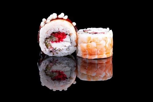 Рис, нори, сыр, масаго, огурец, креветка, унаги соус, рисовые шарики.