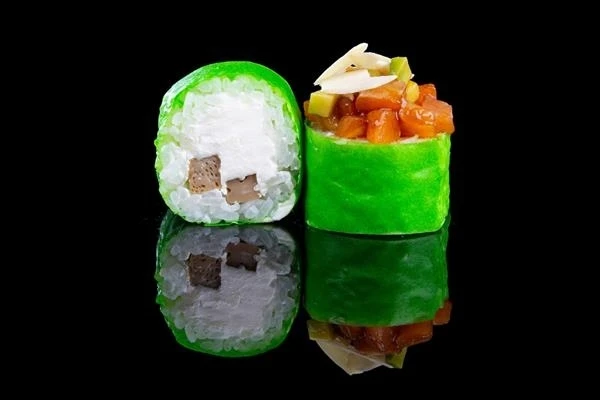 Маменори зеленая, рис, сыр, омлет, лосось, авокадо, унаги соус, миндаль.