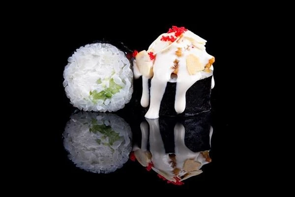 Рис, сыр, огурец, креветка, унаги соус, сливочный соус, масаго, миндаль.