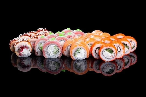 Филадельфия с тунцом (рис, нори, сыр, огурец, тунец, ореховый соус, тобика.), Филадельфия (рис, нори, сыр, огурец, лосось.), Королевская креветка (Рис, нори, сыр, масаго, огурец, креветка, унаги соус, рисовые шарики.), Калифорния (рис, нори, снежный краб, майонез, огурец, авокадо, масаго.).