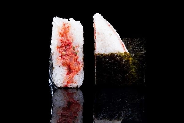 Нори, рис, лосось, огурец, масаго, спайси соус, унаги соус.