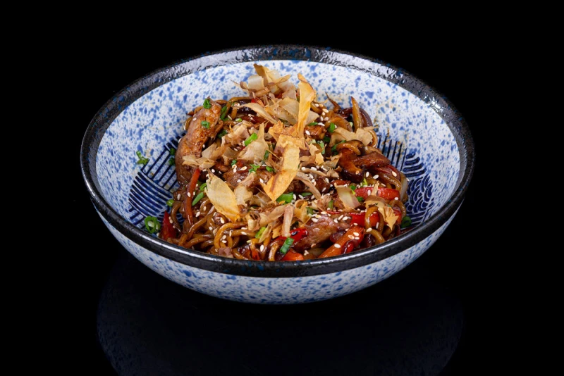 Лапша рамен (ручной работы), капуста пекинская, свинина шея, морковь, черный перец, ростки маш, грибы шиитаке, лук красный, лук зеленый, лук, соус якисоба, соус соевый, кунжут жареный, стружка тунца.