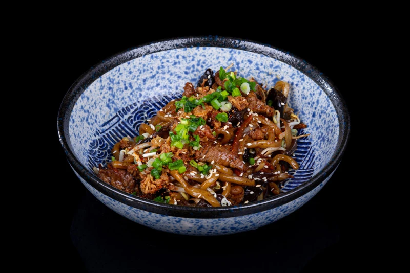 Свинина шея, морковь, грибы муэр, капуста китайская, лук красный, лапша удон (ручной работы), имбирь, ростки маш, лук криспи, лук зеленый, шичими тогараши, соус соевый, соус мирин, сахар.