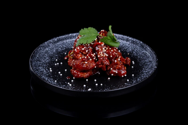 Курица караагэ (куриное бедро, горчица, соус соевый, перец белый, чеснок, имбирь, крахмал), соус батин, рисовые шарики, лук зеленый.