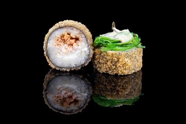 Не горячее блюдо! Нори, рис, сыр, лосось жареный, кляр, сухари, спайси соус, чука, ореховый соус.