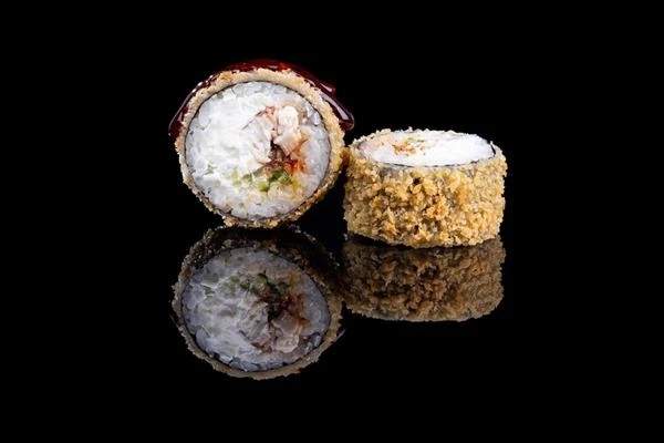 Не горячее блюдо! Рис, нори, сыр, угорь, огурец, кляр, сухари, унаги соус. Могут попадаться кости в угре.