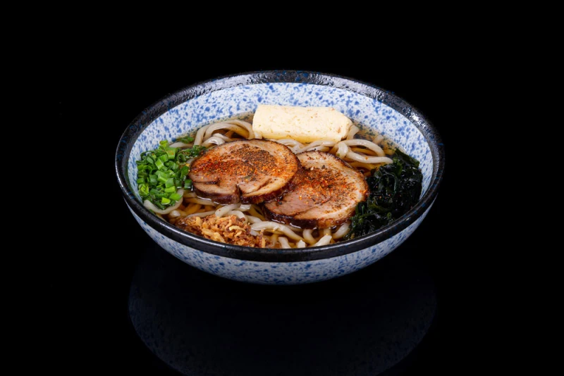 Лапша удон (ручной работы), бульон менцую, свинина часю, омлет тамагояки, водоросли вакаме, лук криспи, лук зеленый, масло креветочное, шичими тогараши.