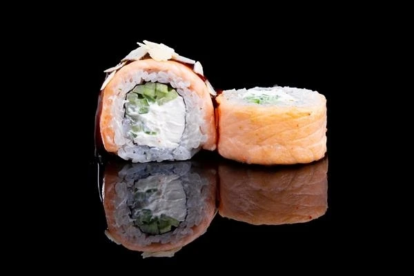 Не горячее блюдо! Рис, нори, сыр, огурец, лосось, унаги соус, миндаль.