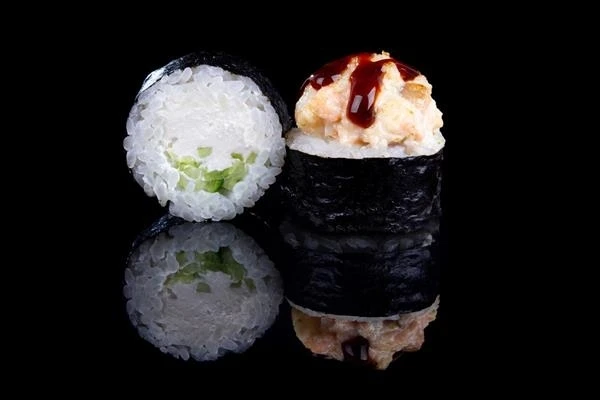 Не горячее блюдо! Рис, нори, сыр, огурец, креветка, лосось, императорский соус, пармезан, унаги соус.